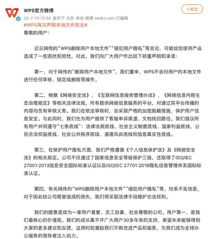 WPS再发声明:不会对用户的本地文件进行任何审核