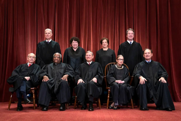 当地时间2018年11月30日,美国华盛顿,美国联邦最高法院大法官合影。第一排从左至右分别为斯蒂芬·布雷耶(已退休,接任的为凯坦吉·布朗·杰克逊)、克拉伦斯·托马斯、约翰·罗伯茨、露丝·金斯伯格(已去世,接任的为埃米·巴雷特)、萨缪尔·阿利托;第二排从左至右分别为尼尔·戈萨奇、索尼娅·索托马约尔、埃琳娜·卡根、布雷特·卡瓦诺。图/IC photo