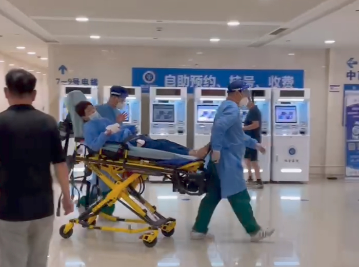 刘宇跟药房的三个医生一起去寻找保安,但并没有看到他们的身影。很快,11点25分,刘宇拍到了第一段伤者的视频,保安和护士从二层大厅靠近中央的位置推着一位伤者出来,“那人应该是从儿科门诊出来,走到收费处倒下了,但在我的角度看不清哪里受伤了。”紧接着,医护人员又接连从儿科门诊里推出了三个伤者,“第一个是穿蓝色防护服的男医生,右手包扎着,感觉是个穿刺伤,我想他可能是看刀过来时下意识地用手去挡,他的意识是清醒的。第二个是名女护士,平躺着,可能是晕倒了,但没有看到出血。第三个是个小孩。这几个人都没有戴氧气面罩,可能都是外伤。”