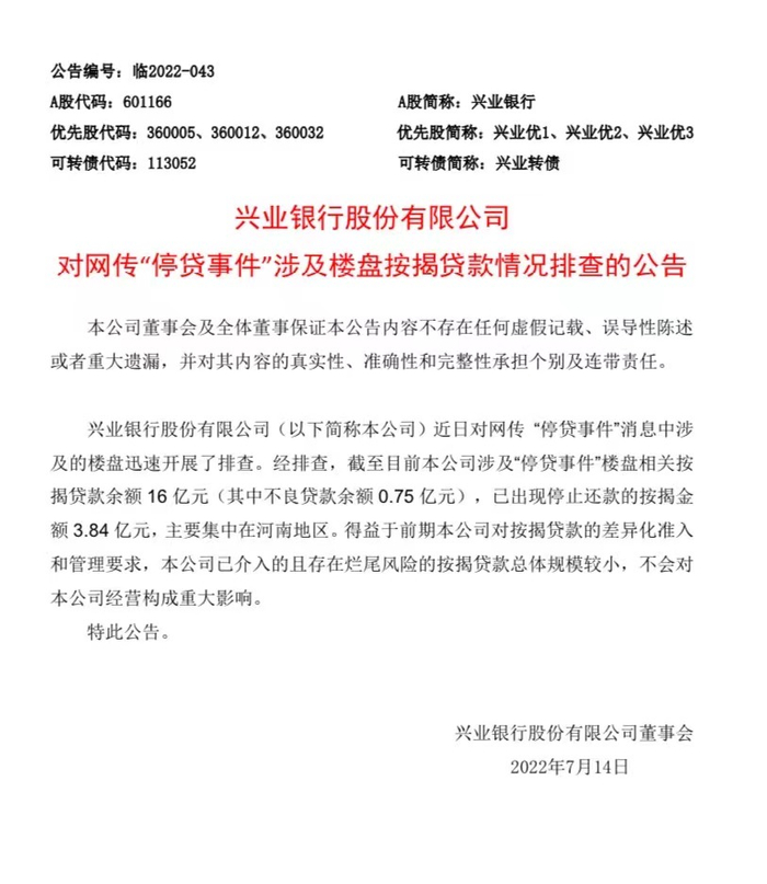 兴业银行公告表示,经排查,截至目前该行涉及“停贷事件”楼盘相关按揭贷款余额16亿元(其中不良贷款余额0.75亿元),已出现停止还款的按揭金额3.84亿元,主要集中在河南地区。总体规模较小,不会对公司经营构成重大影响。