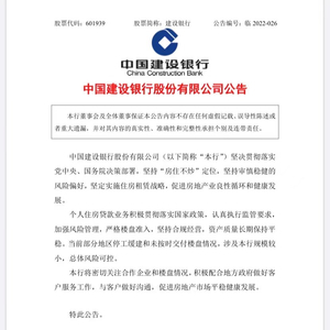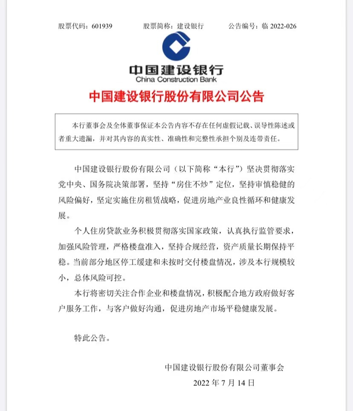 7月14日,建设银行发布公告表示,当前部分地区停工缓建和未按时交付楼盘情况,涉及该行规模较小,总体风险可控。本行将密切关注合作企业和楼盘情况,积极配合地方政府做好客户服务工作,与客户做好沟通,促进房地产市场平稳健康发展。