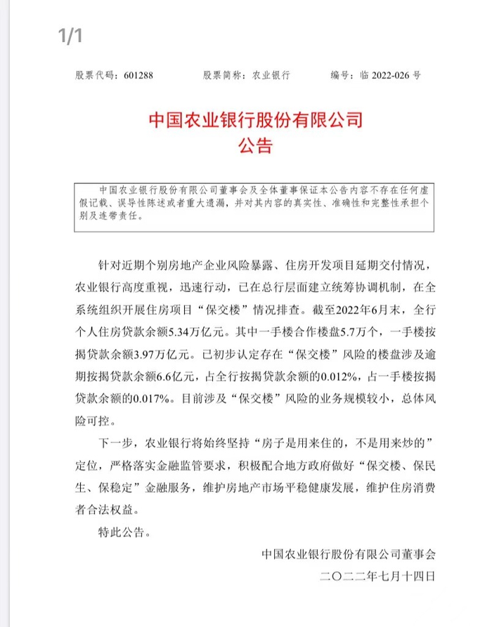 农业银行发布公告表示, 针对近期个别房地产企业风险暴露、住房开发项目延期交付情况,农业银行高度重视,迅速行动,已在总行层面建立统筹协调机制,在全系统组织开展住房项目“保交楼”情况排查。截至2022年6月末,全行个人住房贷款余额5.34万亿元。已初步认定存在“保交楼”风险的楼盘涉及逾期按揭贷款余额6.6亿元,占全行按揭贷款余额的0.012%,占一手楼按揭贷款余额的0.017%。目前涉及“保交楼”风险的业务规模较小,总体风险可控。