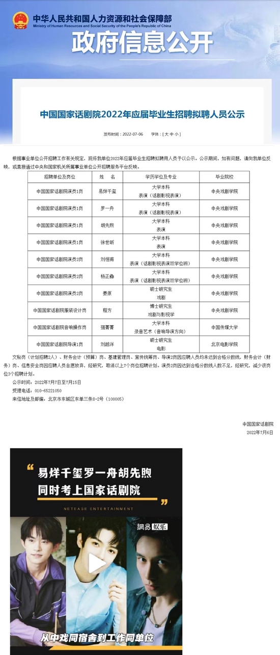 7月6日,中国国家话剧院公开发布了2022年应届毕业生招聘拟聘人员公示,上面显示有十位拟聘用人员,其中易烊千玺、罗一舟、胡先煦三位知名艺人是在演员一岗。有网友说,这三人是中戏的室友,如今考编进入同一单位,所以戏称为“超强事业编宿舍”。除了这三位知名演员外,合格的还有徐世昕、刘恒甫、杨正彝、姜原四位演员。