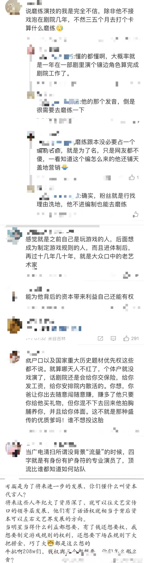 当然,是不是合格的在编话剧演员,网友眼睛也是雪亮的。像作为“中国国家话剧院演员”的李冰冰也录了视频祝福,但她公开的资料中显示参演的话剧只有2001年的《我认识的鬼子兵》,20多年没有话剧作品,所以有网友称“没演过话剧的话剧演员”。而没有话剧作品的章子怡也曾不止一次被质疑,直到去年还有网友发问“竟然一个话剧都没有演过,这样也可以保留编制和福利吗”?此外,以“人才引进”的方式被招进的张艺兴,也遭到过网友的质疑。在很多人印象中,话剧演员的声台形表的功底要求非常高,不少优秀的影视演员不见得是好的话剧演员,宣传阿秋也提到,男团出身的张艺兴在演技方面一直饱受诟病,所以当时批评声音也不少,“但只要不出圈成为社会新闻,在粉丝控评下,路人的声音可以被掩盖”。