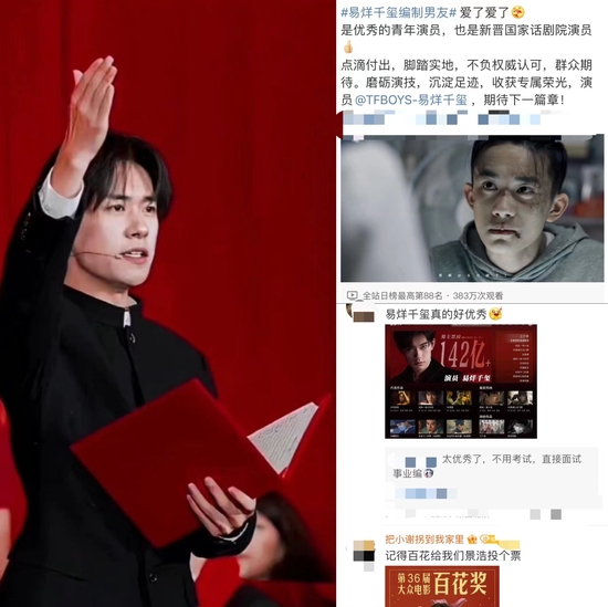 与以往流量艺人的“喜事”宣传方式差不多,没有意外,#易烊千玺罗一舟胡先煦考上国家话剧院#的词条很快登上热搜。还在公示阶段,粉丝们已经开始庆祝了“恭喜”!“未来可期”,“我的养成系真的养成了”,还有的赞“真的太牛了,休息的三个月准备大学毕业论文顺利毕业+拍了一系列商务物料代言+考编顺利上岸”。炫耀模式一开启,很快#易烊千玺编制男友#的热搜词条也安排了,“我的体制内男友,毕业即入编,是谁羡慕我不说”。