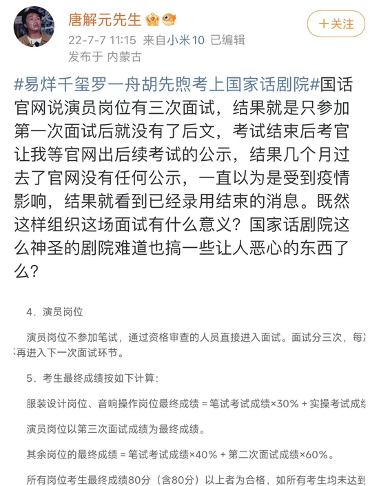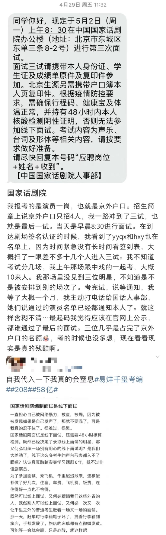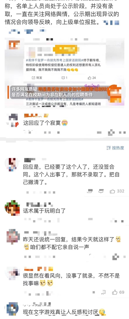 此时,网友评论的风向已经大变。很多人表达了自己的不满并质疑这三位是否符合中国国家话剧院的招聘条件?为什么没有笔试可以直接到面试环节?同时,微博名为“唐解元先生”的素人考生也发了微博讲述自己参加考试的经历“考试结束后考官让我等官网出后续考试的公示,结果几个月过去了官网没有任何公示”。并质疑“既然这样组织这场面试有什么意义”。此外,还有网友称自己“报考的是演员一岗”,“我那场里没见到三位明星”。