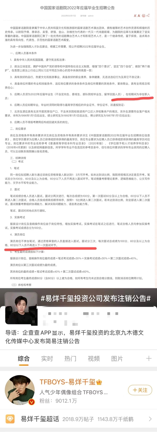 更多“路人”看到易烊千玺等人无需笔试直接进入面试的流程也相当不满,一时间争议四起。根据国家话剧院2022年3月发布的《中国国家话剧院2022年应届毕业生招聘公告》的招聘流程显示“演员岗位不参加笔试”,“通过资格审查的人员直接进入面试”,“面试共三次”。但也提到“招聘人员为在校期间非在职人员”,而易烊千玺有自己的工作室,之前影视作品无数,不知是否可以算“非在职人员”,与此同时,又有人发现其个人独资企业在7月4日进行注销并发布简易注销公告,注销的公告日期为7月4日至24日,于是#易烊千玺个人独资企业申请注销#也登上了热搜。