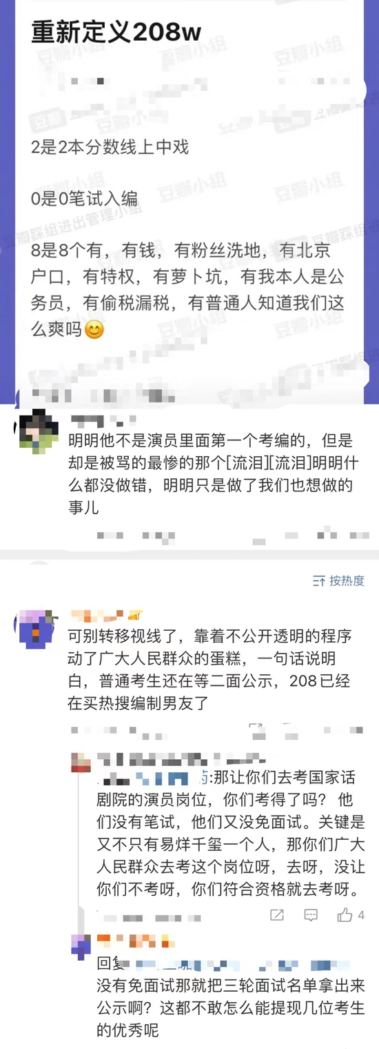 但与粉丝欢庆的画风不同,有网友的“吐槽”却引发了更大的共鸣“普通人考编考公有多难,这些人已经是208W了,还想方设法利用明星特权抢占普通人的资源,直接面试,不用笔试,还要买热搜吹”。一时间,“208”也登上了热搜,继某爽的“日薪208W”之后,“208”又有了新定义。