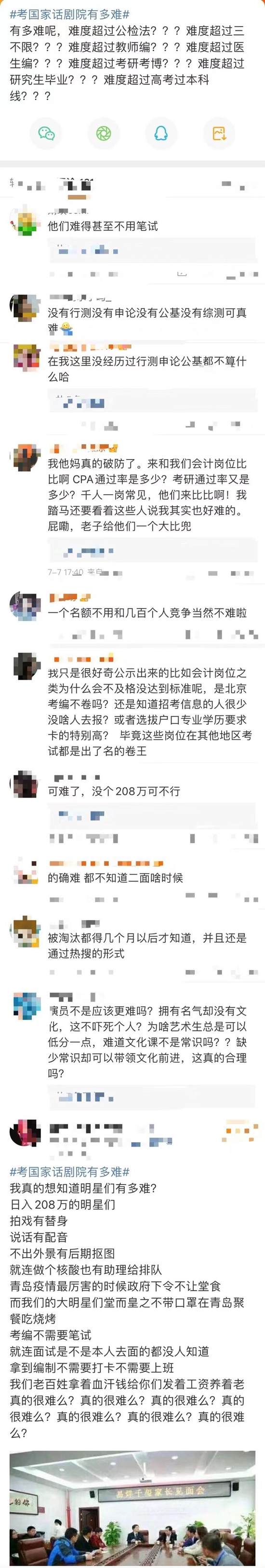 在没有等来相关回应的时候,热搜#考国家话剧院有多难#来了,这个时候就是上赶子找骂,“通过资格审查后需要进行三次面试,比考其他同类艺术剧院难多了”,“每次面试总成绩为100分,60分及以上为合格,60分以下人员不再进入下一次面试环节”,而第三次面试成绩为最终成绩。刷这个热搜话题估计也是想让大家夸夸这几个知名艺人有多优秀,但要知道对比2019年,今年他们可是取消了笔试环节,所以评论里没有意外“翻了车”:“有多难呢?难得甚至不用笔试!”,“在我这里,没有经历过行测申论公基都不算什么”。