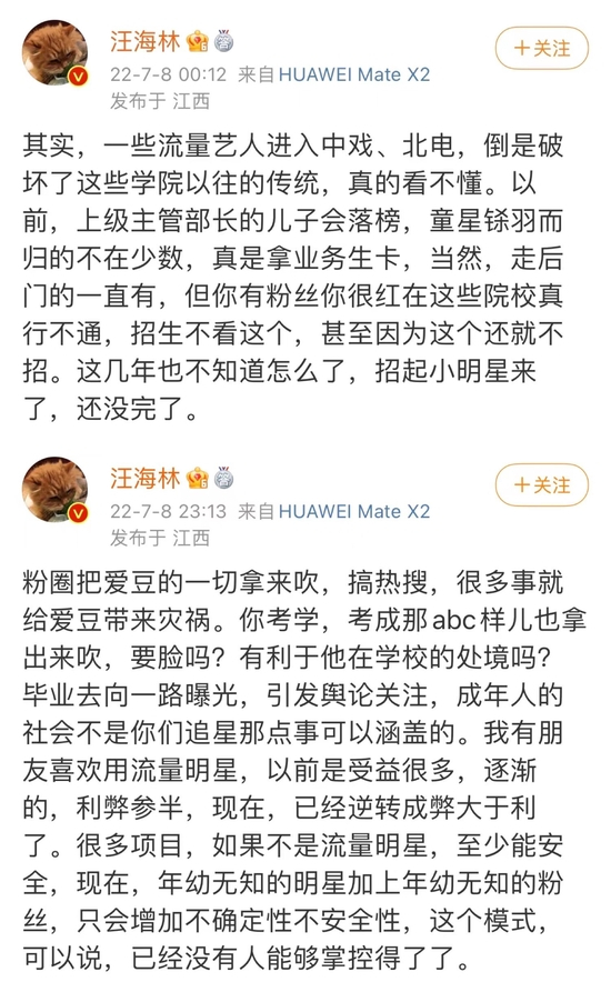 而粉丝们得意夸耀爱豆的“优秀”是真的让人高不可攀只能“酸”了吗?不一定!爱豆们的高考成绩每年都会让大家“重点关注”。可以看到,不少“爱读书”、“很努力”的爱豆最终只考了300多分,数学20多分大有人在,而过了400分就要吹“学霸”了。同样,这一次,这三位年轻艺人,还只是在公示期,也没有演什么剧目,粉丝就开始迫不及待的吹起来了。路人还不能有任何疑问,否则会被粉丝追着骂到“闭麦”,甚至会“举报禁言”。“这次粉丝跟往常一样也是控评捂嘴,但只要出圈变成社会新闻,粉丝捂不过来的,热搜词条没了,但大家的质疑并没有停止”,有人问“为啥艺术生总是可以低分,难道文化课不是常识吗?缺少常识却可以做‘文化领域’的事,这真的合理吗?”