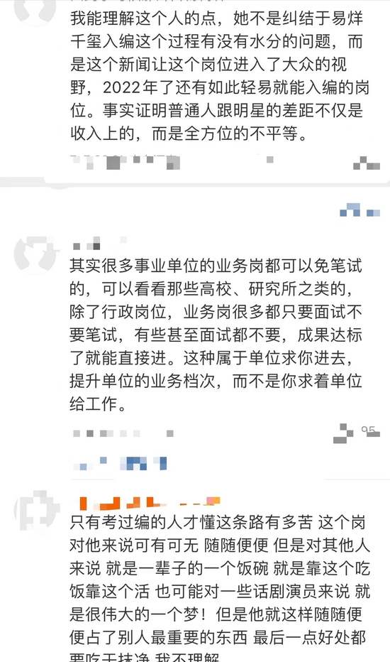 可以看到,对于演员们考编是否公正透明大家一直是有疑问的,只是每次都不了了之,但这次大家的不满已经让粉丝无法“控评”。在阿秋看来,一方面是因为四字弟弟的粉丝“战斗力”太强,还在公示期间,就刷上好几个词条上热搜。这两年,整体就业环境的改变,让考公成了很多年轻人的新选择,对于普通人来说,考公考研都是“卷生卷死”,苦不堪言。而一线明星们已经享受了娱乐资本化的红利,在极短的时间内获得了巨大的收益,作为社会资源和财富的既得利益者们,还要挤占普通人少得可怜的上升通道和生存空间,实在太“贪得无厌”。与此同时,粉丝还要“敲锣打鼓”地宣告,那自然会引来路人围观,有网友表达不满“真要有话剧梦,天天泡剧院排话剧我也服,但更多只是为了混个身份而已”。相比普通人考编,明星更是连笔试都不用,而且考编后工作还那么自由,不耽误赚钱,“名利双收,真是‘既要又要’,大家本来已经积攒了很多不平,一些粉丝还在趾高气扬、得意忘形地炫耀,讽刺对此不满的网友,肯定会激发众怒啊!”