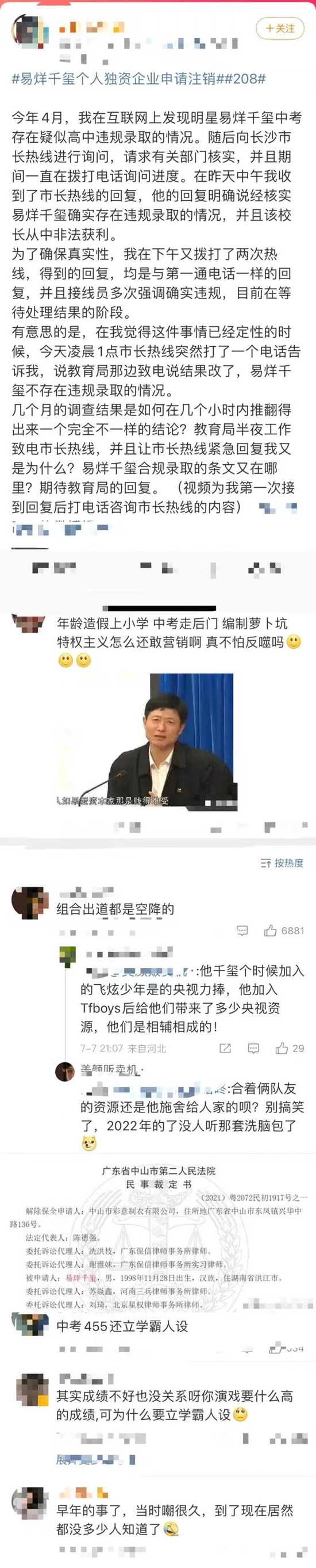 热搜“降”得很快,但很快有其他相关内容轮番“登场”,比如易烊千玺父亲的公司,以及背后家族的相关信息和言论都让人咂舌……信息越挖越多,一时间粉丝的“控评速度”也有些跟不上。而为易烊千玺“站台”的评论更是用考公普通人自嘲的“小镇做题家”来进行讽刺,也引发网友更大的愤怒。