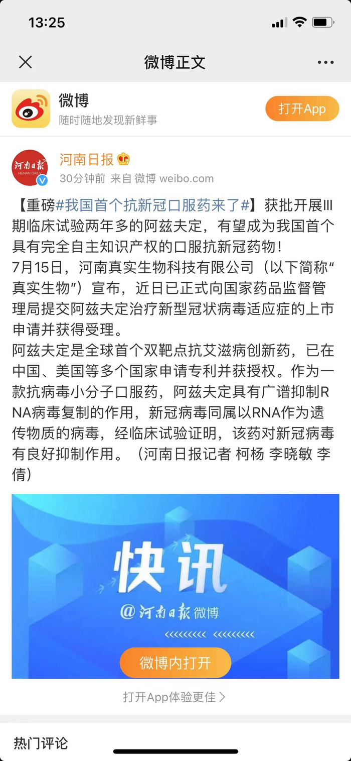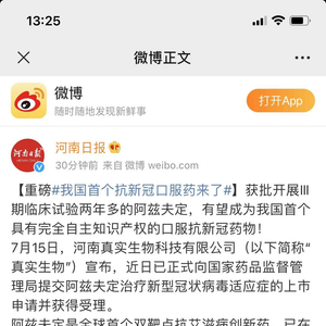 据河南日报微博消息,获批开展Ⅲ期临床试验两年多的阿兹夫定,有望成为我国首个具有完全自主知识产权的口服抗新冠药物!
