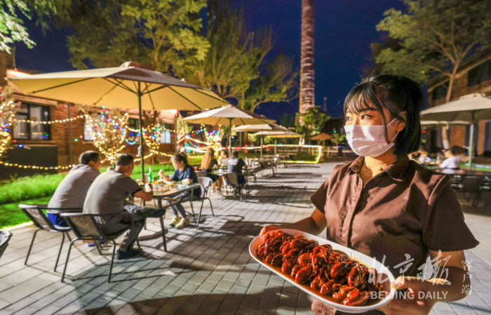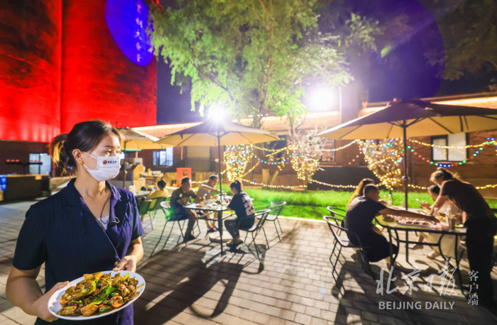 晚8时,天色完全暗了下来,户外用餐区的人气儿反而更旺,不断有顾客来这里用餐。“上周六户外用餐区全满了,有的客人凌晨左右才吃完饭,我们营业时间一直到后半夜两点。”首钢大食堂经理崔向坤一整个晚上都在忙碌着招待客人。根据他的观察,餐厅每周六晚客人最多,越来越多的顾客会在晚上特地来到园区用餐,近期不少客人来电咨询时,都会选择预订户外用餐区,羊肉串、小龙虾、首钢汽水、三高炉雪糕是夏日新菜单上的人气单品。