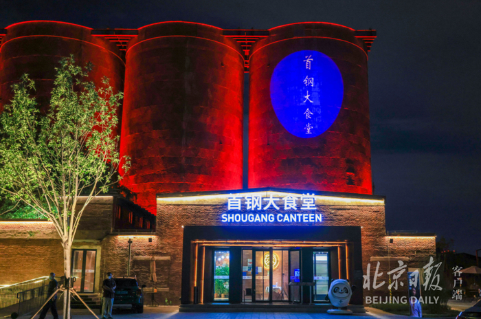 在厂东门广场附近,位于高空步道起点处的烟囱顶部戴上了“光环”,对面处园区人气餐厅“首钢大食堂”背后的巨大筒仓被红色灯光照亮。伴随着音乐声,餐厅的霓虹灯牌亮起,母女俩没有去室内用餐,扫码测温后落座户外用餐区,点了烤串和麻辣小龙虾,女儿还特意点了瓶首钢汽水。