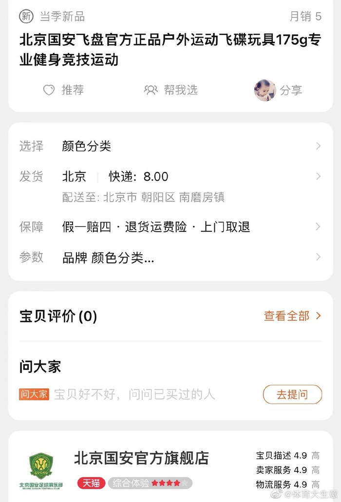 红星新闻记者搜索到,这款名为“北京国安飞盘官方正品户外运动飞碟玩具175g专业健身竞技运动”的飞盘确实在北京国安天猫官方旗舰店出售,售价为88元,还不包邮。