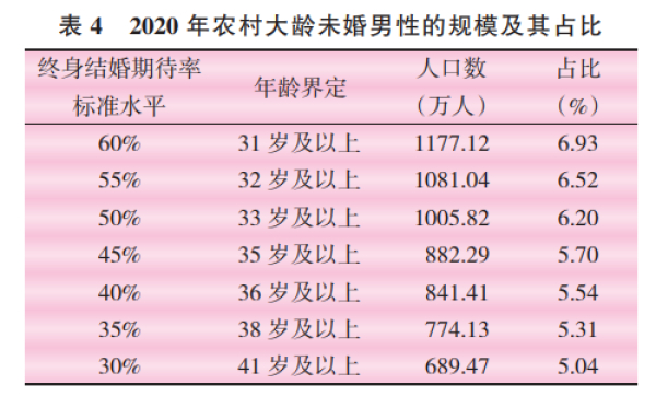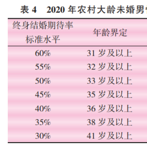 结合中国当前的社会经济发展背景,考虑到实际研究与政策制定的需求,《中国农村大龄未婚男性的年龄界定研究》一文作者认为,一般情况下可以选择45%作为终身结婚期待率标准水平,将中国农村大龄未婚男性的年龄界定为35岁及以上。“这一建议是针对2020年全国范围内农村大龄未婚青年群体提出的,且具有一定的主观性。研究者可以根据目标时期与区域,结合自身的研究需求,选取不同的终身结婚期待率标准进行农村大龄未婚男性的年龄界定。”