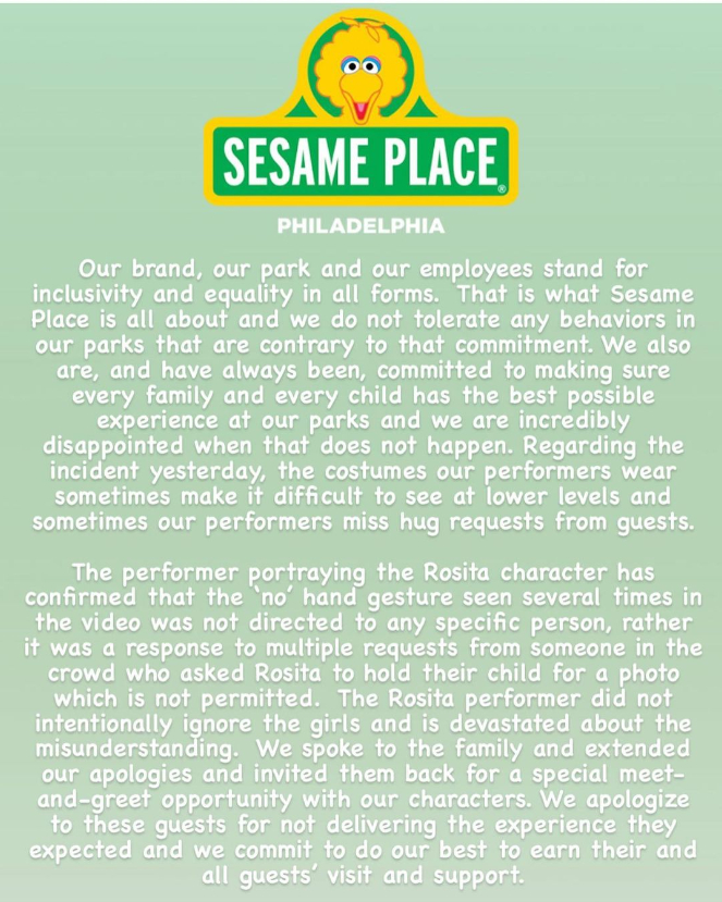 声明中,芝麻街强调,该游乐园的品牌、园区、员工代表着各种形式的包容与平等,因此,不能容忍这里发生任何违背这一主旨的行为发生,“我们致力于让在这里的每一个家庭、每一个小朋友获得最好的体验。”