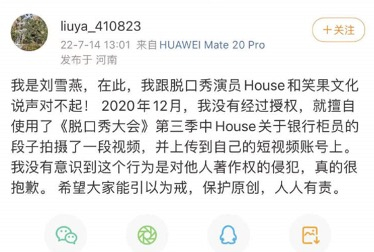 根据目前已经在微博发布了道歉声明的其中一位被告自述显示,“2020年12月,我没有经过授权,就擅自使用了《脱口秀大会》第三季中‘House’关于银行柜员的段子拍摄了一段视频,并上传到自己的短视频账号上。”该人士称,自己当时没有意识到这个行为是对他人著作权的侵犯,“(我)真的很抱歉。希望大家能引以为戒,保护原创,人人有责。”