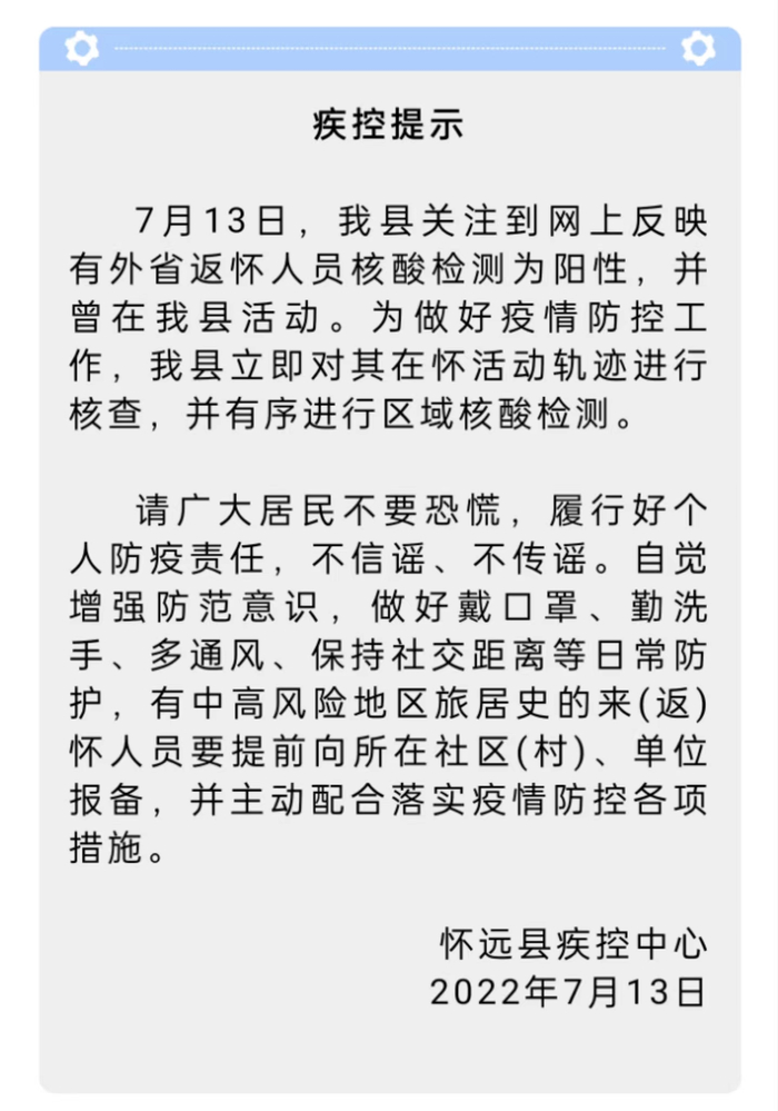 7月15日,怀远发布“全县实施封闭管理”的通告,宣布在7月14日的核酸筛查中发现了151例初筛阳性。