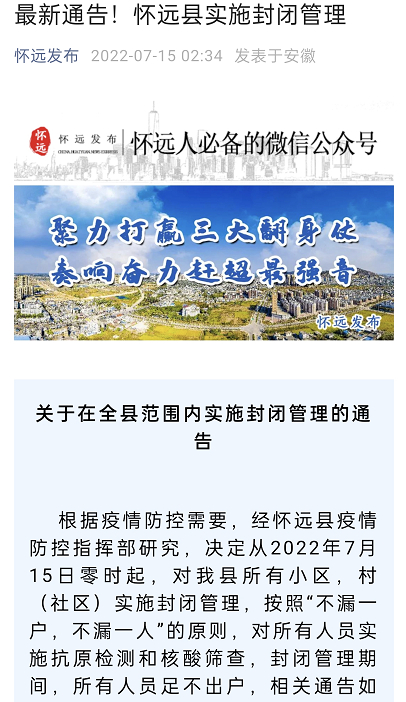 7月15日凌晨,“怀远发布”公众号突然贴出了全县实施封闭管理的通告,决定从当天0时起,对所有小区、村(社区)实施封闭管理,对所有人员实施抗原检测和核酸筛查,封闭期间所有人员足不出户。