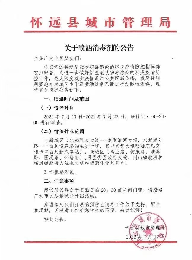 不仅如此,17日,怀远县还发布了关于喷洒消毒剂的公告,决定于7月17日至7月23日期间,连续7天每日21:00—24:00利用雾炮车对城区主干道喷洒过氧乙酸进行预防性消毒。