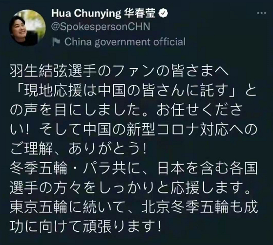 羽生结弦甚至还获得了外交部的点赞——去年日本粉丝托中国粉丝帮助因疫情无法到场的他们,在现场为羽生加油助威,时任外交部发言人华春莹了解后,特意用日语发了推特:“请放心交给我们”。
