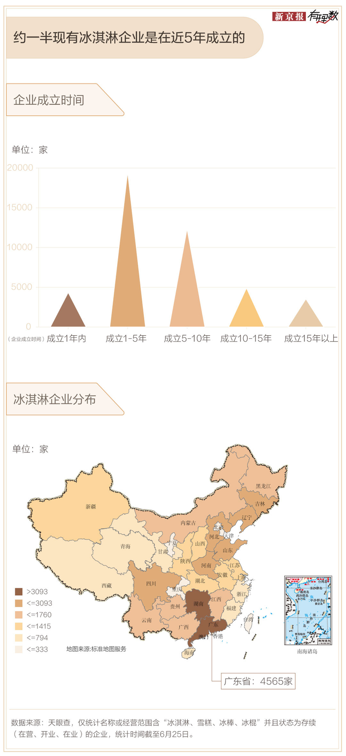 数据显示,目前经营状态为“在业、存续、迁入、迁出”,经营范围含冰淇淋、雪糕、冰棍、冰棒企业共4.45万家,其中近2万家是在近五年内成立的,超9成为个体工商户。