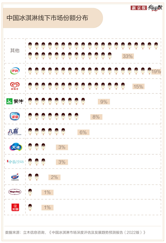 据《中国冰淇淋市场深度评估及发展趋势预测报告(2022版)》数据,伊利、和路雪、蒙牛、雀巢4家品牌线下市场份额分别达到19%、15%、9%和8%,合计达51%。其中,和路雪和雀巢都属于国外品牌。