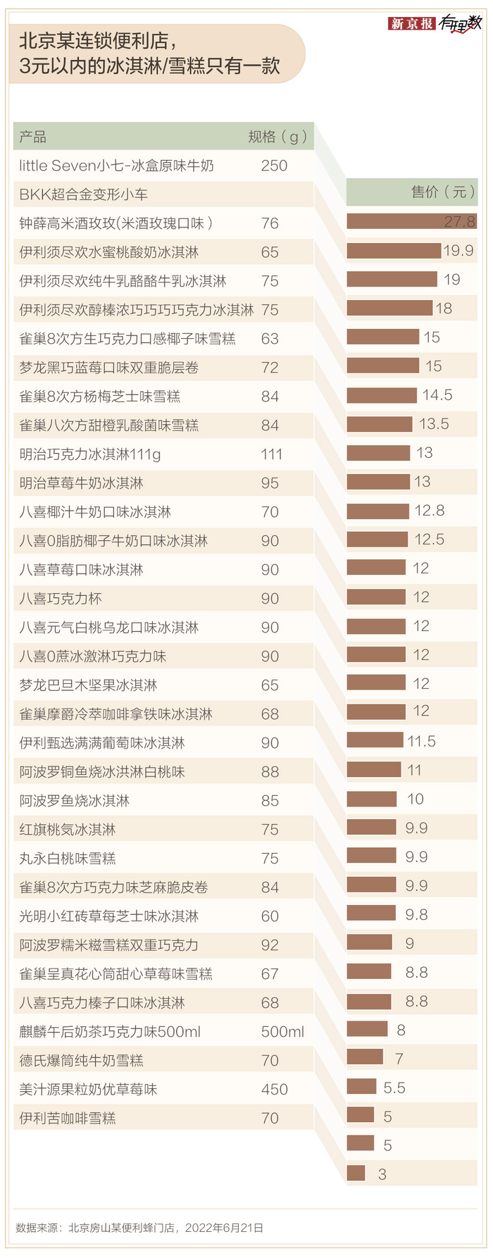 对此,6月21日,新京报记者随机走访了一家位于房山区的便利店,发现店内所售的冰淇淋、雪糕价格都在3-27.8元不等。通过统计其主要售卖的34款冷饮产品发现,售价在5元以内(含5元)的仅有3款,5-10元(含10元)的有11款,10-20元内的多达19款。