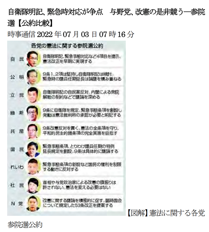 据《朝日新闻》报道,包括日本最大在野党立宪民主党在内的多个政党在7月3日日本广播协会(NHK)的辩论节目中明确表达了反对修宪的意见。