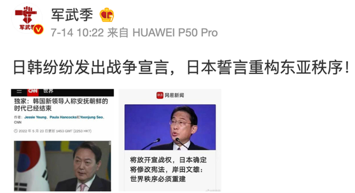 另一方面,网传消息将岸田在俄乌冲突背景下的言论与日本的修宪议题及亚太局势联系在一起,也非无中生有。据新华社报道,岸田就任首相以来,在多次外访活动中提到,“任何地区不允许以武力单方面改变现状”,试图将欧洲变局与亚太局势进行捆绑,刻意渲染“台海问题”,有意将俄乌冲突话题延伸至亚太区域。
