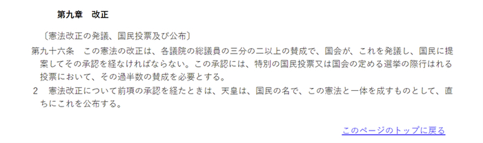 《日本国宪法》第96条规定,针对宪法产生的任何修订,都必须获得国会两院三分之二以上立法者的批准,然后在全国公投中以多数票通过。