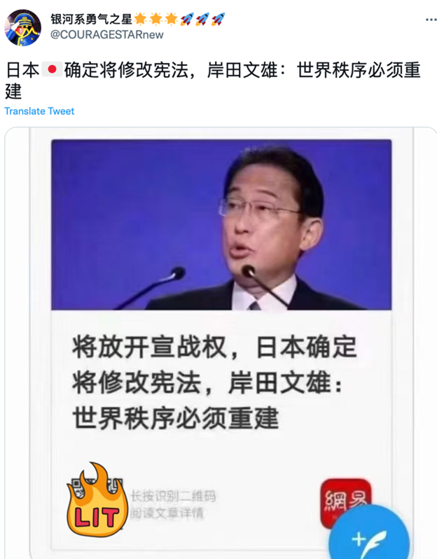近日,一则声称日本“将开放宣战权”“确定将修改宪法”的消息在微博、推特等平台流传。消息提到日本首相岸田文雄,称其表示:世界秩序必须重建。