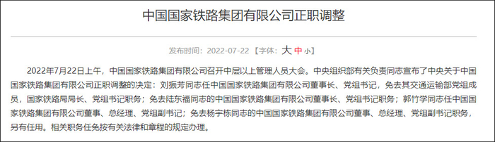 中央组织部有关负责同志宣布了中央关于中国国家铁路集团有限公司正职调整的决定:刘振芳同志任中国国家铁路集团有限公司董事长、党组书记,免去其交通运输部党组成员,国家铁路局局长、党组书记职务;免去陆东福同志的中国国家铁路集团有限公司董事长、党组书记职务;郭竹学同志任中国国家铁路集团有限公司董事、总经理、党组副书记;免去杨宇栋同志的中国国家铁路集团有限公司董事、总经理、党组副书记职务,另有任用。相关职务任免按有关法律和章程的规定办理。