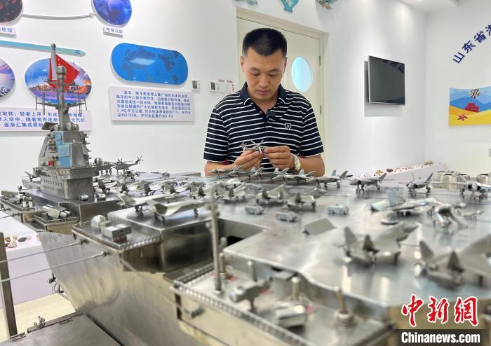 中新网烟台7月22日电 (孙睿姣 王凯 闫奇琪)不到一平方米的甲板上雷达、火箭炮应有尽有,舰载机甚至可以遥控“起飞”……这是山东烟台男子任百林制作的逼真不锈钢航母模型。