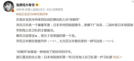 南京寺庙供奉日本战犯事件从被举报曝光开始的一个个进展和细节,持续刷新着微博热搜。而直到南京市委市政府迅速做出回应,“吴啊萍”,一直固定在热搜榜前几名的位置。