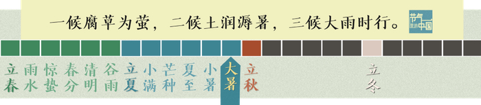 大暑分为三候:“一候腐草为萤,二候土润溽暑,三候大雨时行。”这一时节,天气变得闷热,土地变得潮湿,常常出现暴风骤雨。有趣的是,此时枯草上的萤火虫卵化虫而飞,所以古人误认为萤火虫是腐草变成的。