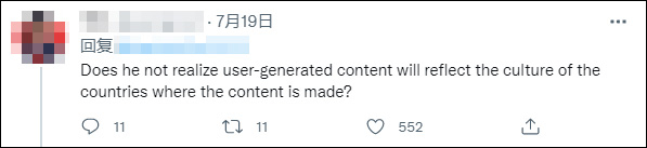 “难道他没有意识到,用户生成的内容反映内容生产国的文化吗?”