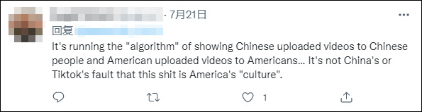 “它运行的‘算法’把中国人上传的视频展示给中国人,把美国人上传的视频展示给美国人……这不是中国的错,也不是TikTok的错,这些狗屎内容是美国的‘文化’。”