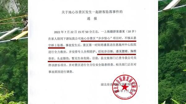 23日午间,湖北恩施地心谷景区发布了一则游客坠落事件通报,通报内容显示,7月22日15时50分左右,一上海籍游客潘某(10岁)在家人陪同下游玩公司地心谷景区“步步惊心”项目,不慎从悬空桥上坠落。事故发生后,景区第一时间将潘某送往恩施州中心医院进行全力救治,并安排专人全程陪护。经初步诊断,潘某腰椎、胸椎骨折,头皮裂伤,暂无生命危险。目前,县文旅部门已责令公司关停该游乐项目,并对景区进行全方位安全隐患排查。