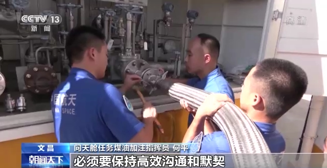 问天舱任务煤油加注指挥员何平:仅一个加注库区就有上百台阀门,加注流程都是环环相扣的,每一个加注动作都必须按照指定时间规范准确完成,因此指挥员和现场操作手之间必须要保持高效沟通和默契。指令从后端发出后,前端必须在第一时间迅速正确完成。