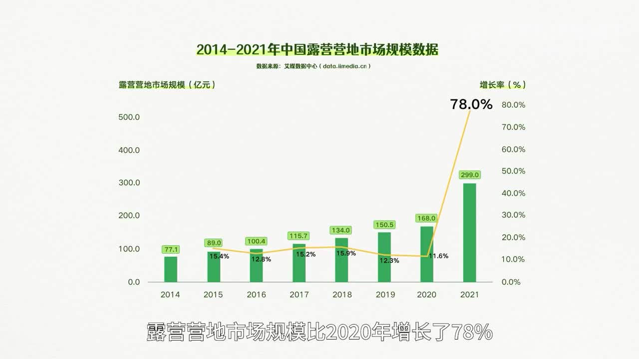 而与此相关的户外露营产业也迎来了爆发式增长,2022年因此被称为“露营经济元年”。据艾媒咨询统计,2021年中国露营经济核心市场规模达到747.5亿元,带动市场规模为3812.3亿元,同比增长率为58.5%。