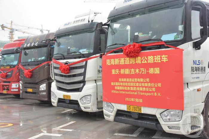 7月2日上午,陆海新通道跨境公路班车“重庆-新疆(吉木乃)-德国”在陆海新通道重庆无水港发车,所载货物均为高附加值电子产品,预计16天左右即可到达德国alblas仓库,这是陆海新通道首次前往德国的跨境公路班车。
