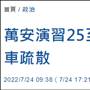 台湾"万安演习"25日至28日举行 三市试行"离车疏散"