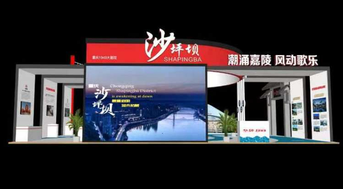 沙坪坝馆以“风动歌乐,潮涌嘉陵”为主题,设计以“重庆1949大剧院”为造型元素,以象征红岩文化的红色为主色,凸显沙坪坝区厚重的历史文化底蕴。同时,展馆还以蜿蜒流淌的嘉陵江作为导览动线,展示了沙坪坝区的重大建设项目,飞速动感的高铁造型,更是突出了沙坪坝站和重庆西站在成渝双城经济圈建设中的重要枢纽作用。
