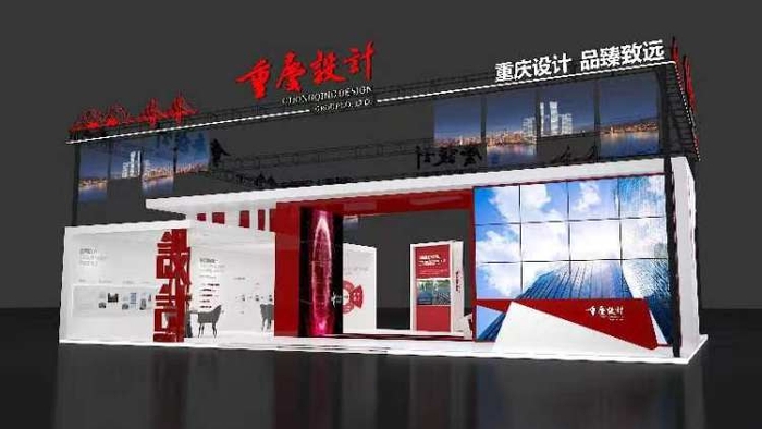 重庆设计集团的展馆以简洁的红白撞色为主,将科技感与时尚感结合。进门处用演变的“设计”二字立体化,配以三角形接待台,带来新颖的视觉冲击力。
