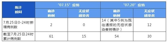 “07.15”疫情新增本土确诊病例2例,无新增本土无症状感染者,系隔离管控中的密切接触者。截至25日24时,本起疫情累计报告本土确诊病例61例,本土无症状感染者15例。
