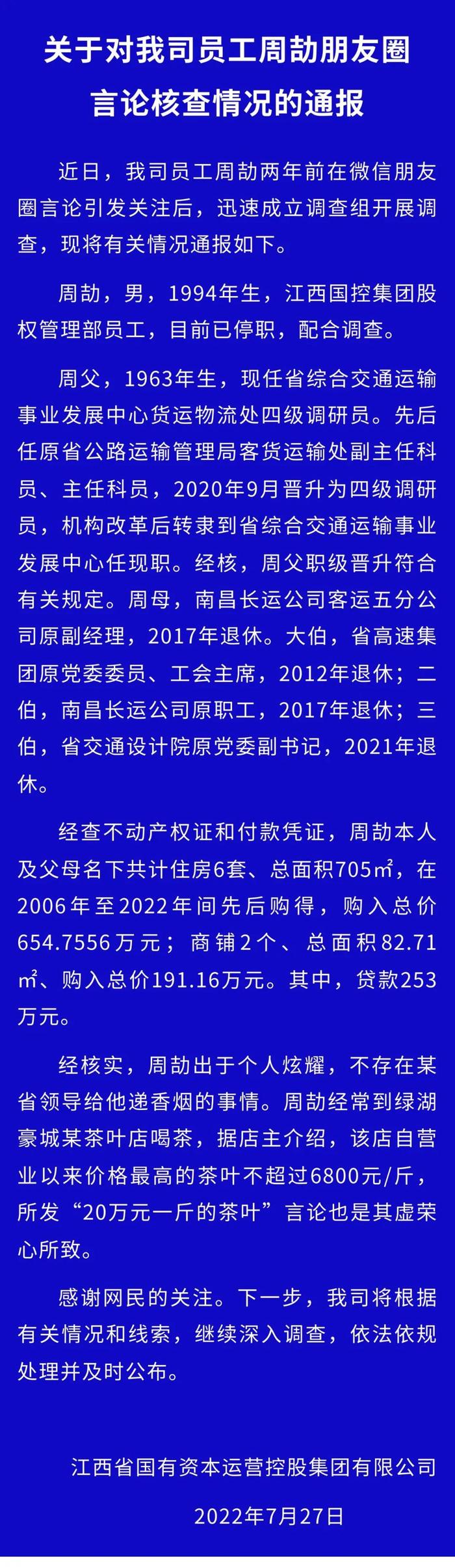27日凌晨,江西国控集团又通报了对周劼朋友圈言论核查情况,宣布其已停职、配合调查,并回应了社会关切的几点问题: