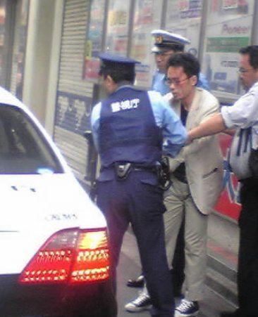 ▲当年犯罪嫌疑人加藤智大(中)被警察逮捕现场